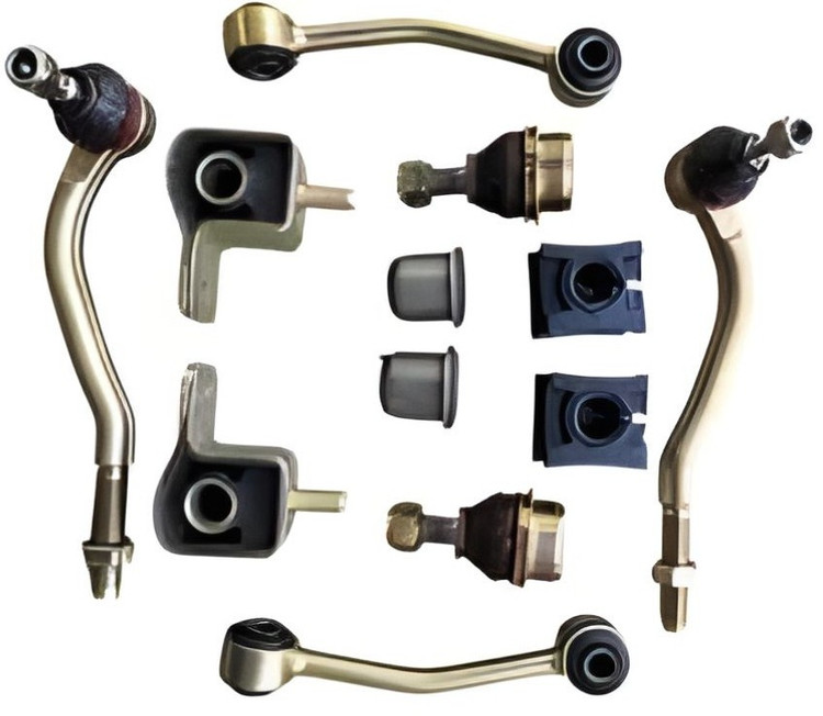 2 عدد بوش طبق جناقی ، 2 عدد بوش طبق لبه دار ، 2 عدد سیبک (چپقی) فرمان ، 2 عدد میل موجگیر(تعادل) پژویی ، 2 عدد سیبک زیر کمک(زیر اکسل) و 2 عدد لاستیک چاکدار