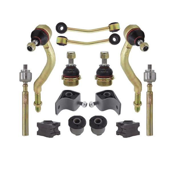 2 عدد بوش طبق جناقی ، 2 عدد بوش طبق لبه دار ، 2 عدد سیبک (چپقی) فرمان ، 2 عدد میل موجگیر(تعادل) پژویی ، 2 عدد سیبک زیر کمک ، 2 عدد لاستیک چاکدار و 2 عدد گوی(قرقری) فرمان